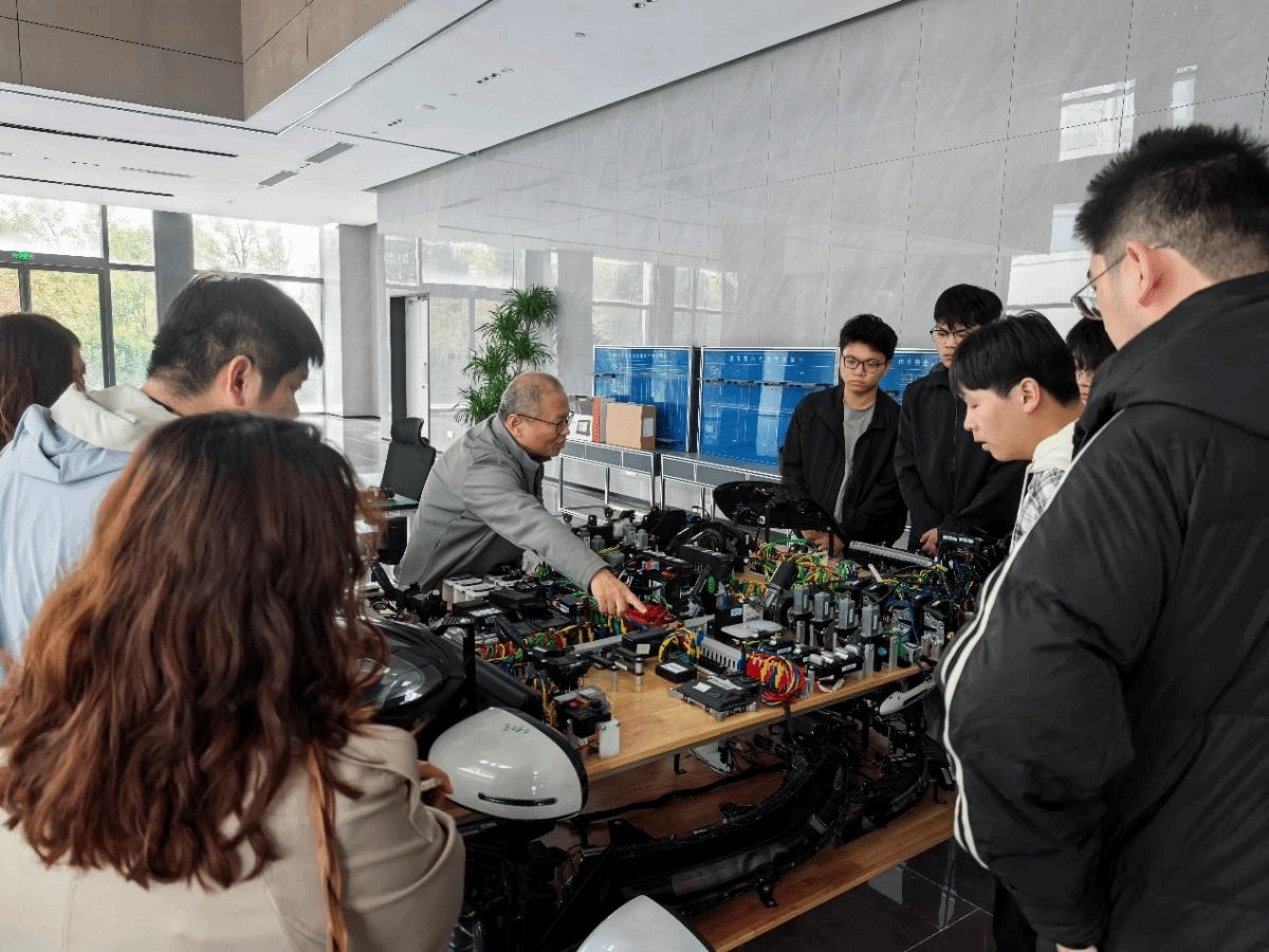 在郭军利教授的引导下,师生代表先后参观了嵩山实验室的汽车实训区、智能控制演示区和数据检测研究区域。郭教授结合行业前沿技术,详细讲解了新能源车辆的关键工艺流程、动力系统构造及相关应用案例,并针对学生专业学习和能力提升提出了宝贵建议。